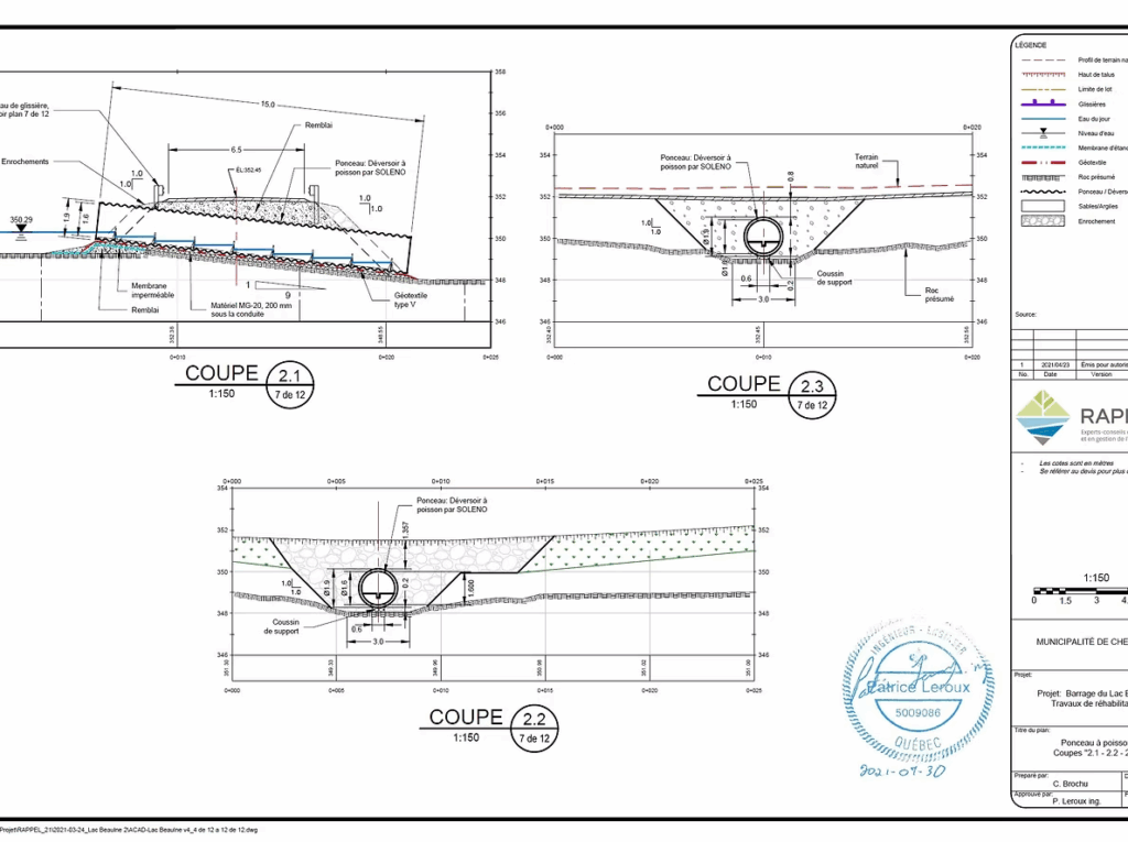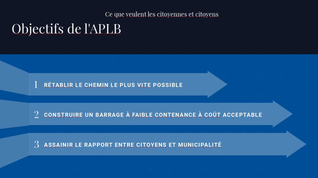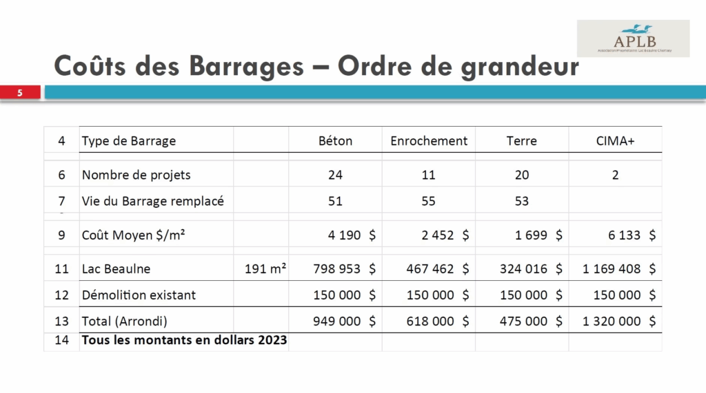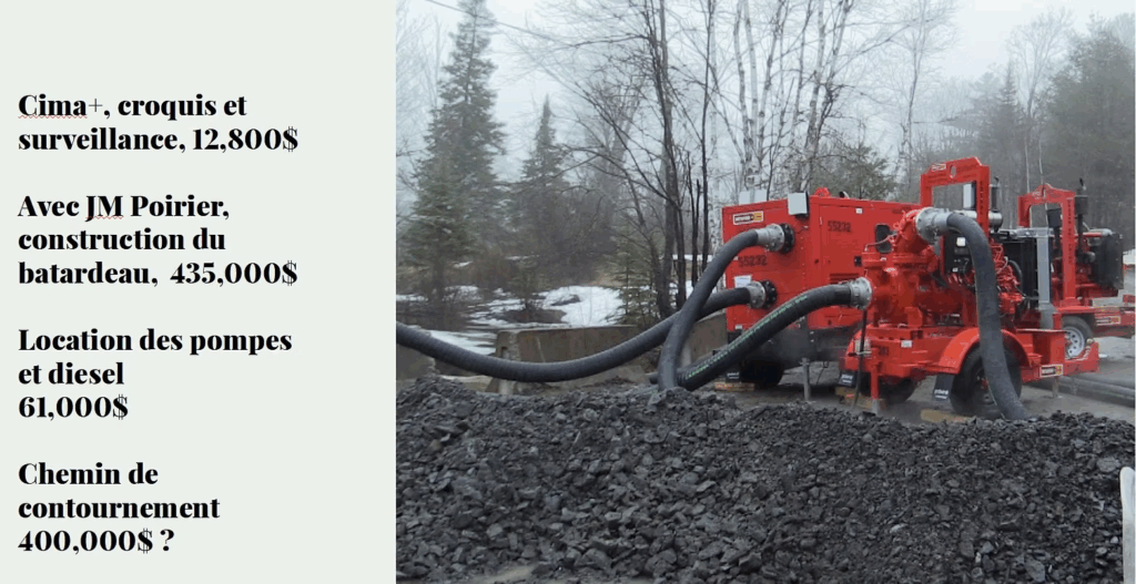 En tant qu’ingénieur, Eric Morin a accès à certains documents et informations plus facilement que nous. Il oeuvre pour aller comparer les types de barrages et les prix de ces ouvrages dans la région. Le tout est dans une éloquent document que nous partageons aussitôt avec la Ville. Pas de réaction de leur part.