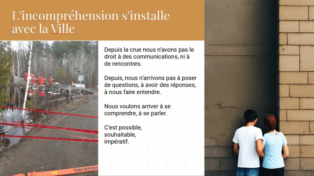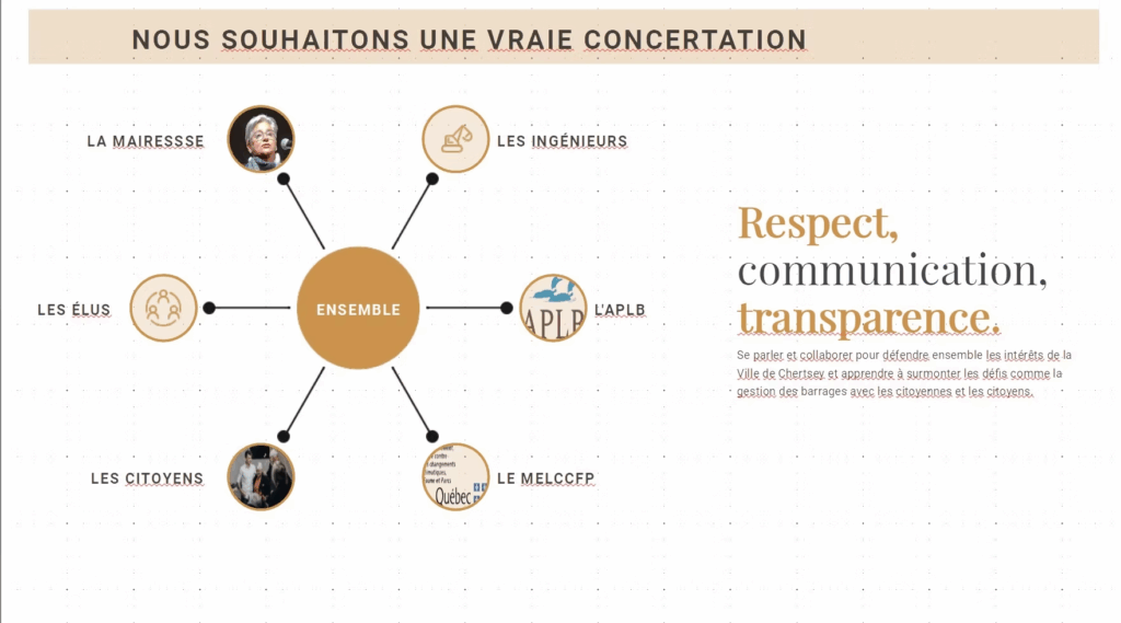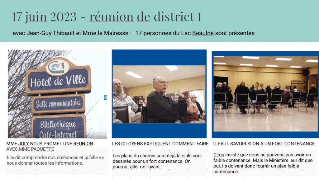 Une pétition est signée par le 85% des riverains et déposée à la Ville. Françoise fait une intervention à la réunion du conseil. On veut notre barrage et la Ville tarde à envoyer les plans à Québec pour les approbations.