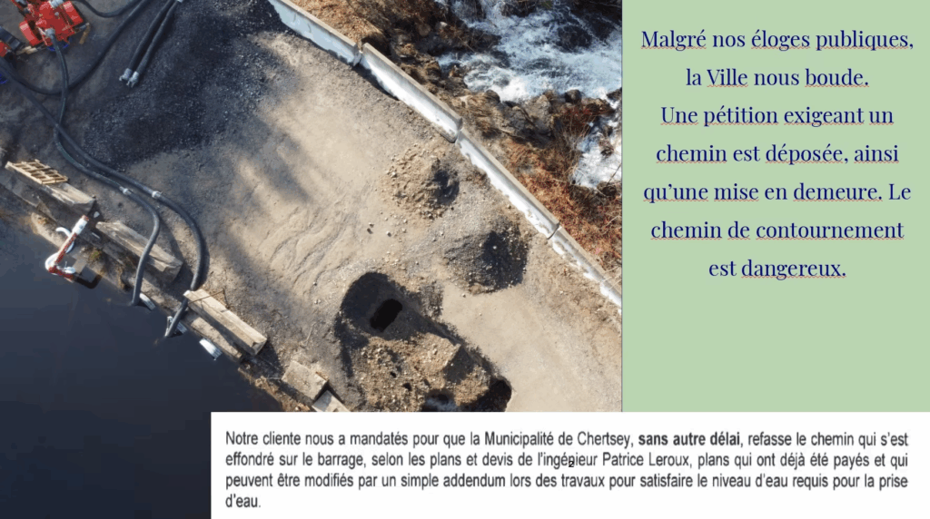 Nous nous rallions à M. Boucher pour être unis face à la Municipalité et contrer son choix de travailler avec des barrages en béton et très chers. Nous exprimons notre souhait à la Ville par écrit. M. Boucher est même prêt à payer les plans et devis de M. Chum.  Ce projet proposé est en enrochement et devrait être réalisé à prix modeste (environ 500.000$). Nous souhaitons que les responsables de la Municipalité rencontrent cet autre ingénieur, connu pour ses nombreux ouvrages en Matawinie, Rawdon, St. Hippolyte, Ste Emilie de l’Energie, etc. Notre demande demeure sans réponse.