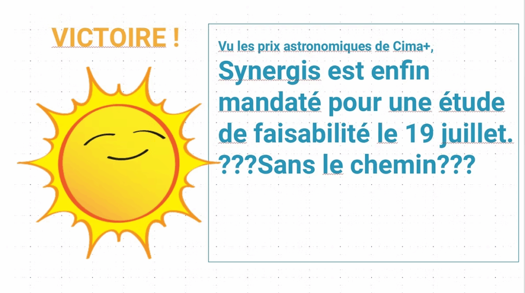 Mme Paquette nous annonce que les élus ont décidé de mandater Cima+ pour une étude de faisabilité de barrage. On ne comprend pas. Pourquoi recommencer à zéro avec une autre firme alors qu’on a déjà payé des plans et devis et obtenu des autorisations pour ces plans?