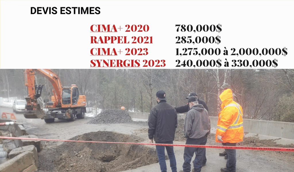 > petit rappel des devis estimés jusqu’à maintenant, après que Tetra Tech en 2016 ait mentionné qu’il faudrait environ 300,000$ pour restaurer le barrage.