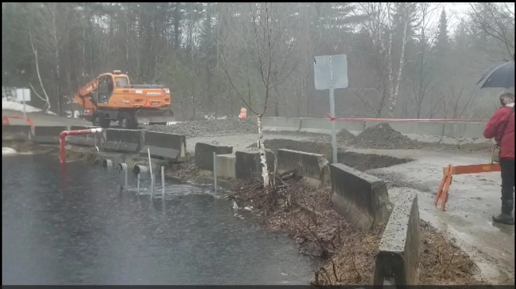 Le courant d’eau sous la chaussée dans ce gros trou de 10 pieds par 10 pieds commençait à miner la structure et à déstabiliser le barrage sous le chemin. De l’autre coté, la pluie incessante faisait augmenter l’eau du lac.