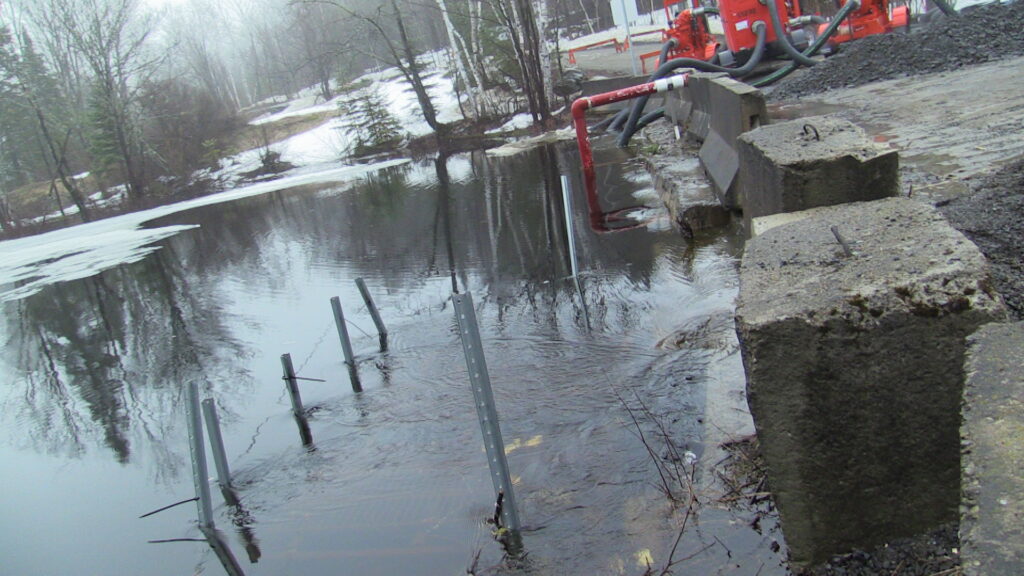 LE 24 AVRIL AU MATIN, le niveau du lac était tellement haut qu’il menaçait de submerger le chemin. Cette condition, ajoutée à celle de l’érosion ou affouillement de l’eau qui tourbillonnait sous la chaussée aurait probablement fini par emporter le barrage. Grâce aux pompes, le niveau a baissé ce qui a réduit la pression sur le barrage 🙂