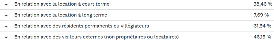 Les nuisances ou incidents identifiés dans le sondage : Excréments de chiens sur les terrains, visiteurs extérieurs utilisant le bord de l’eau pour baignade, vitesse excessive, vtt, chiens sans laisse, bruits le dimanche, musique et conversation quelques fois tard le soir, gros party, feux d’artifice, la musique en journée qui porte beaucoup sur le lac, camions lourds.