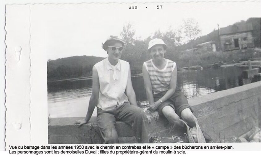 Au début des années 50, Henri Duval opérait la scierie dont on peut encore voir les vestiges en aval du barrage. D’après ce qu’a raconté Henri Duval, son ancêtre avait, dès le début du vingtième siècle, installé un « moulin à scie » mobile sur la glace mais comme elle ne pouvait fonctionner que l’hiver et qu’il voulait l’exploiter toute l’année en profitant de l’énergie hydraulique, il a remplacé le barrage de castors qui maintenait les eaux du lac à leur niveau actuel par un barrage en bois puis par un mur de maçonnerie. Sur le site actuel du barrage il est d’ailleurs toujours possible de distinguer sur ses extrémités est et ouest et du côté de l’eau l’ancien béton datant de près d’un siècle et du côté du chemin, le béton « neuf » qui, érigé en 1972, a servi à renforcer la vieille construction.